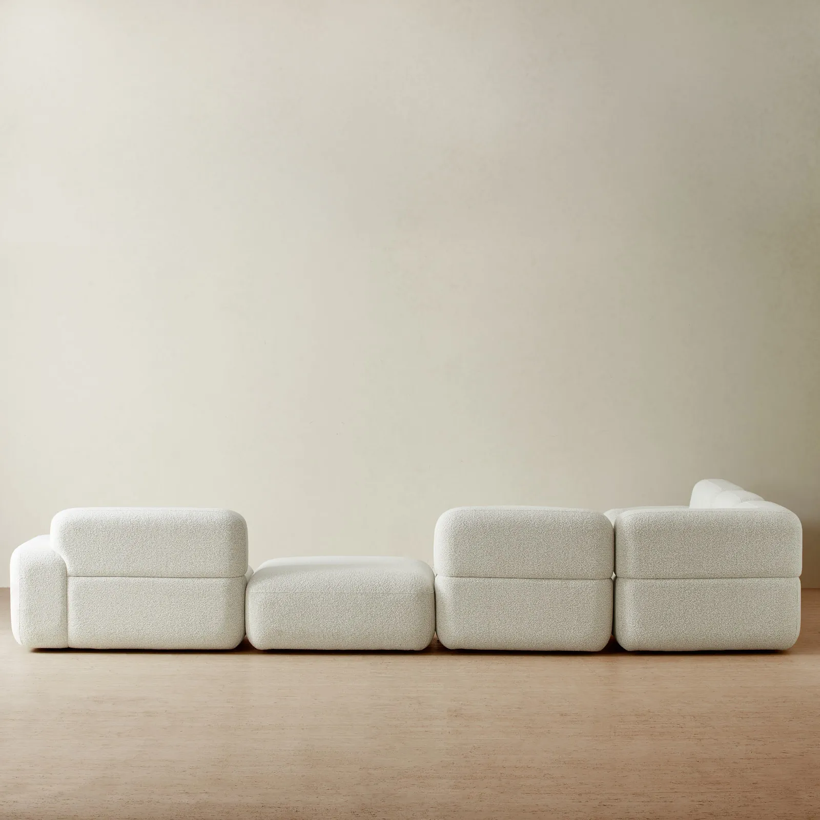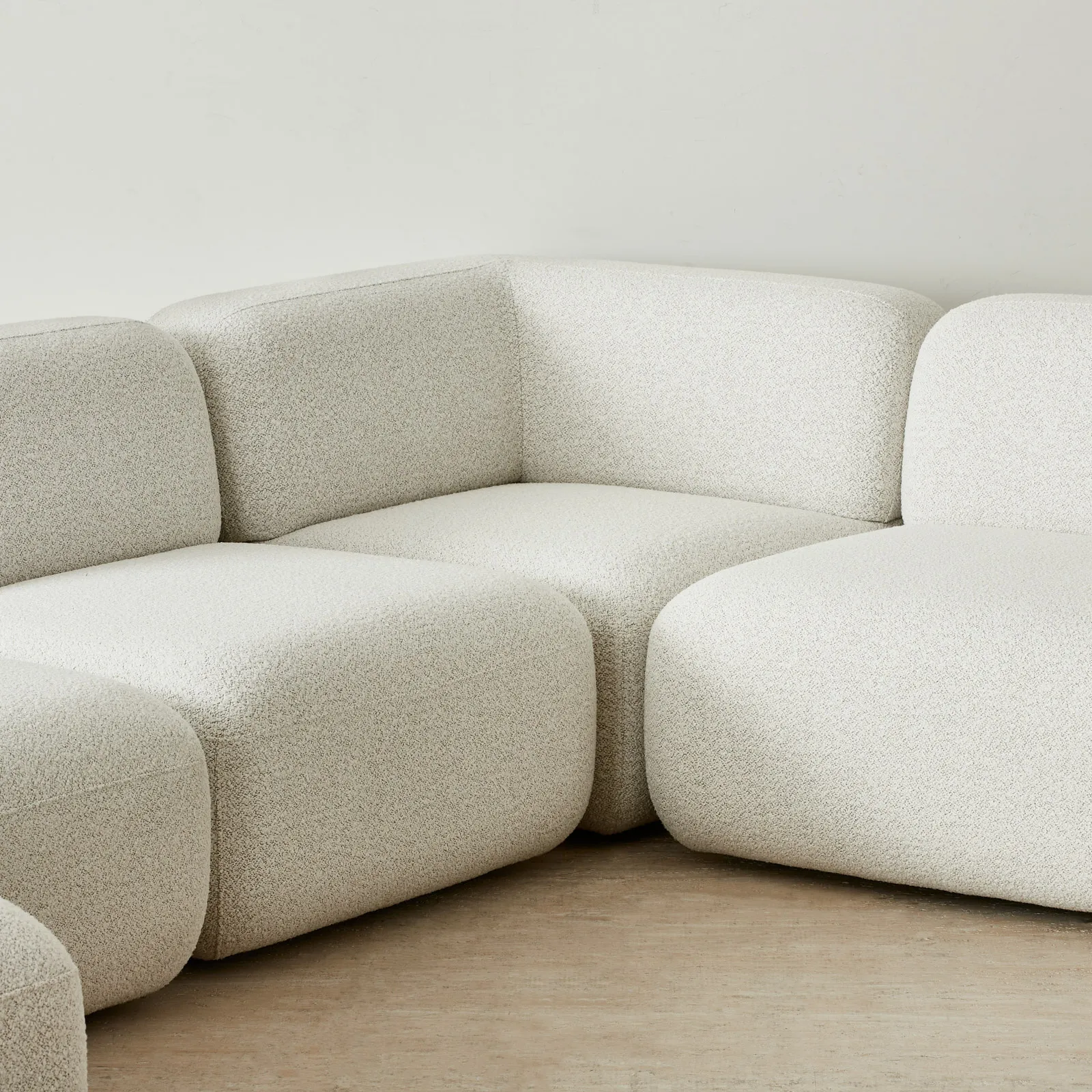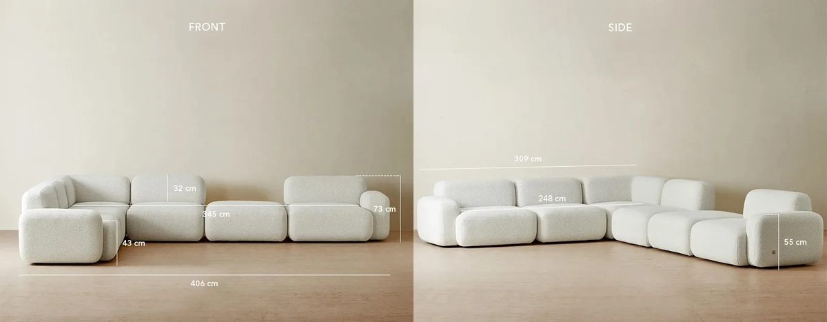 The stone white fabric enhances its minimalist appeal, offering a timeless backdrop for your living area. With a versatile modular design, it combines both style and comfort, adapting to your space with ease.