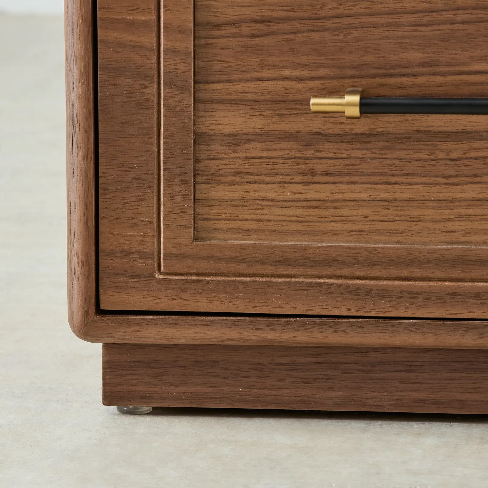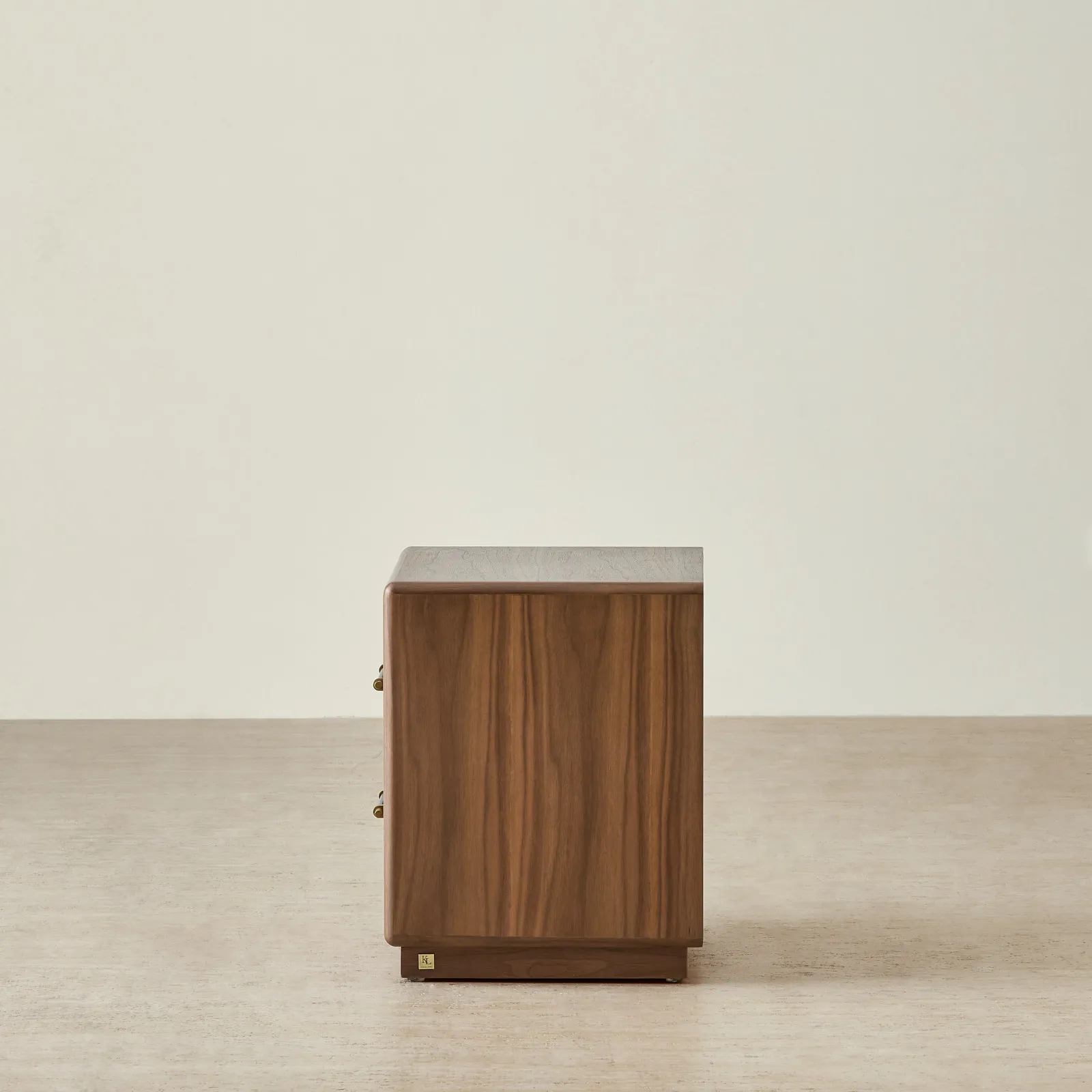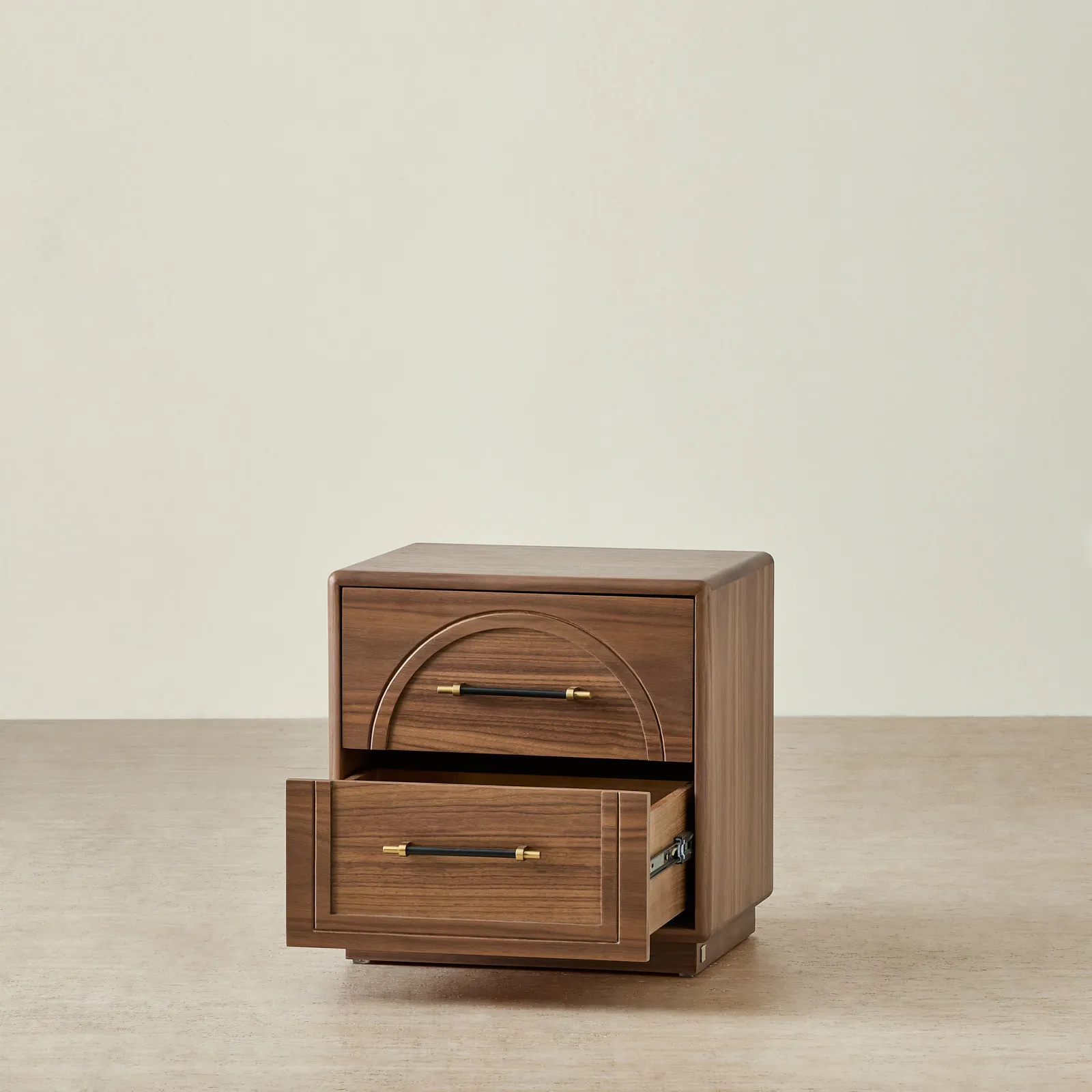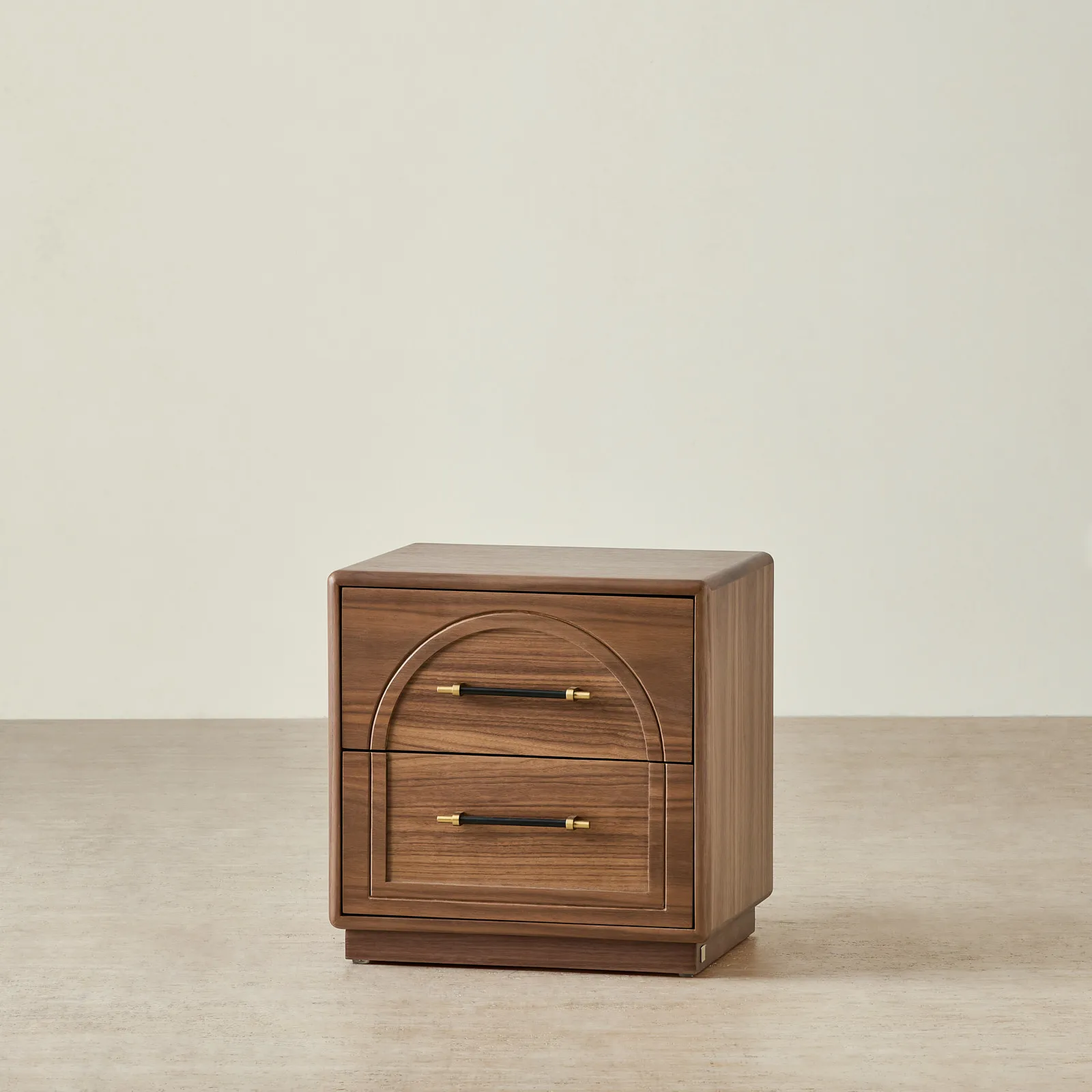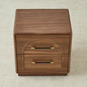 The Costanza Bedside Table is draped in mocha walnut veneer that brings warmth. Its front design features a carved arch detail that adds subtle depth and character.