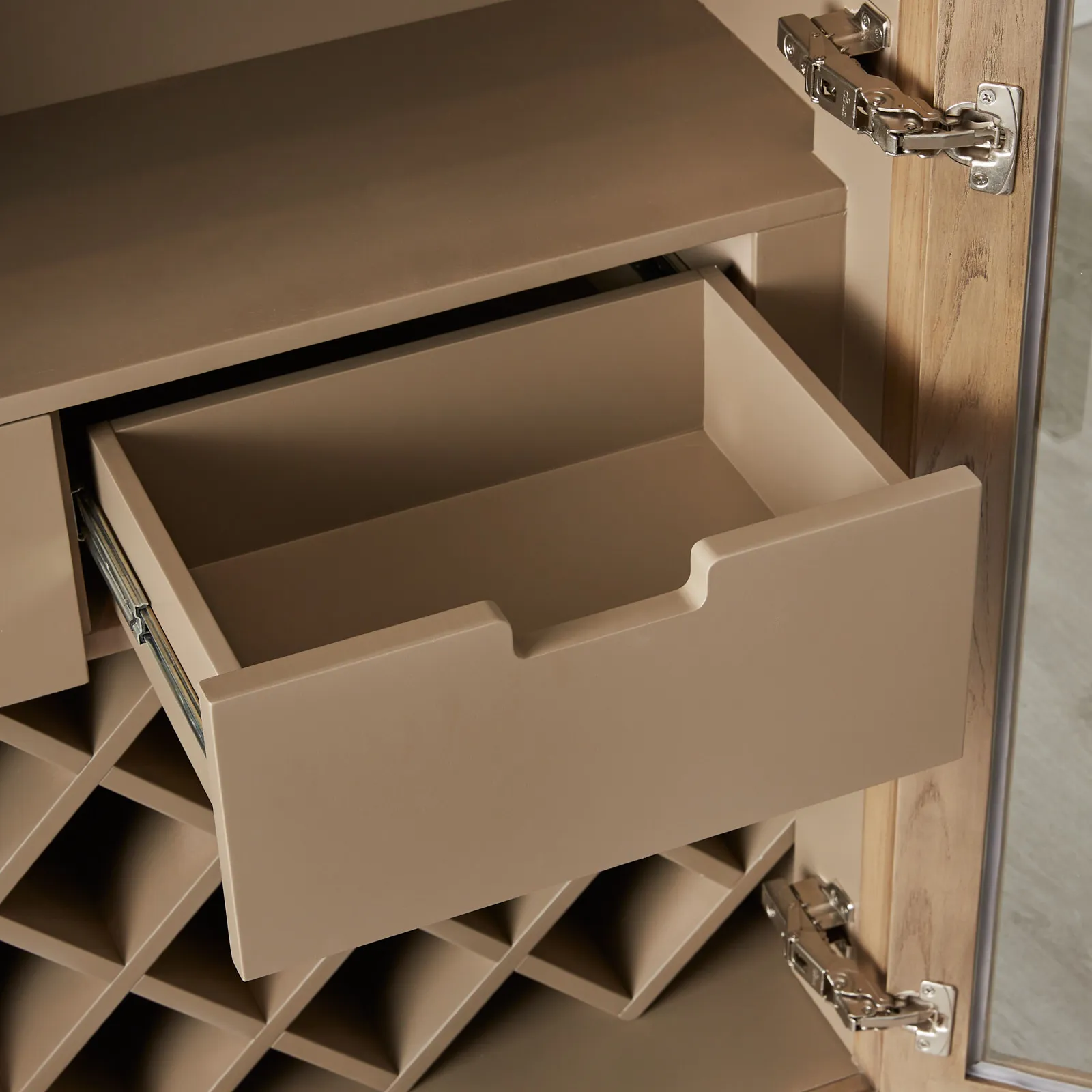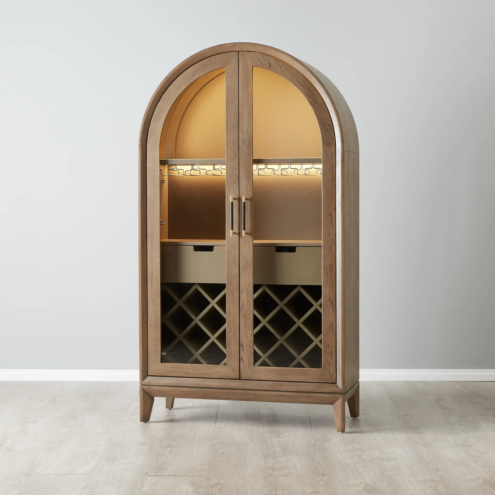Inside this elegant exterior, the cabinet promises functionality as much as beauty. Integrated light strips bathe the interior with a soft glow, highlighting the display cabinet’s array of storage solutions. From the elegant wine racks that cradle each bottle to dedicated glass holders and additional compartments, every aspect has been thoughtfully designed. The Fredrik Wine Display Cabinet isn’t just furniture; it’s a statement piece for those who appreciate the finer things in life.