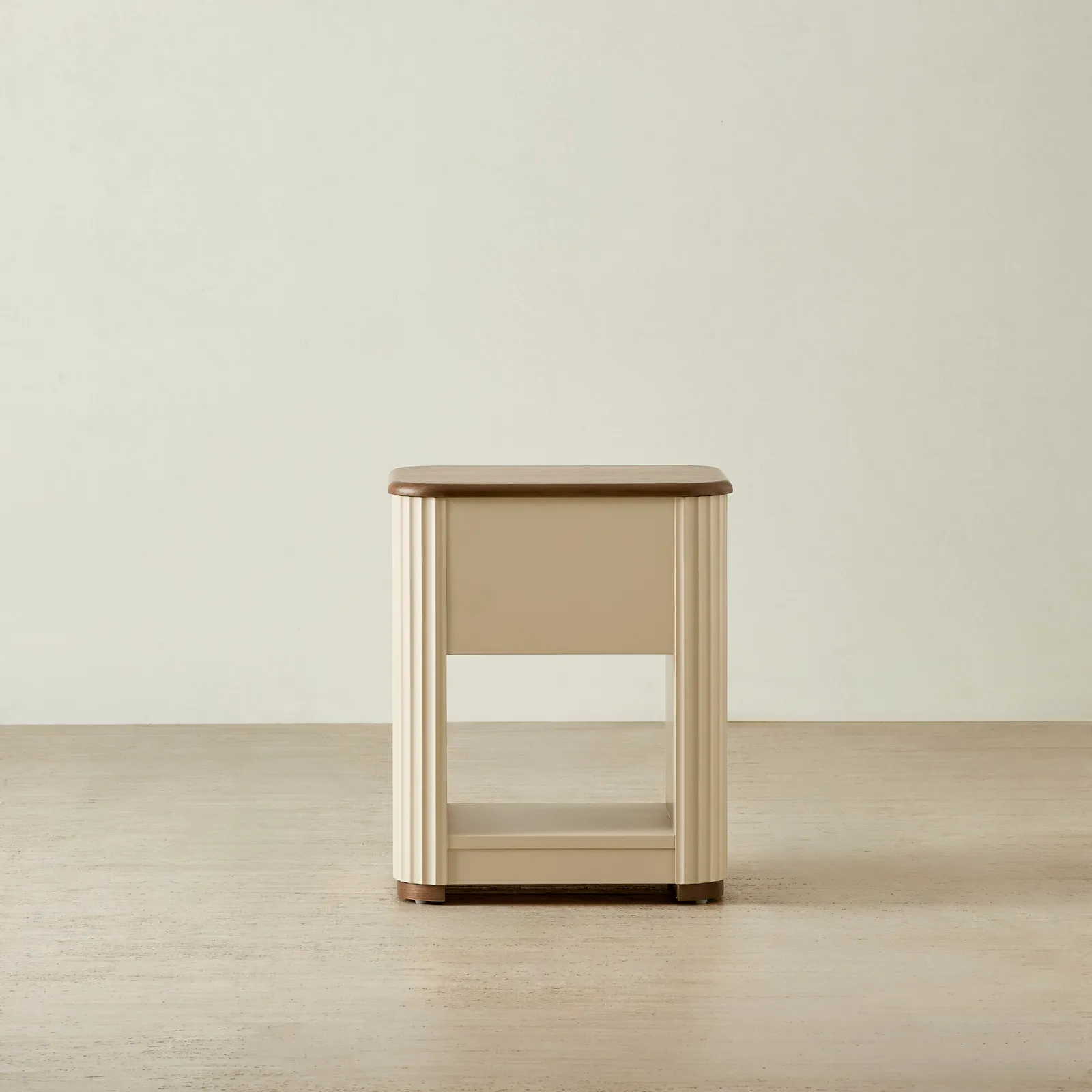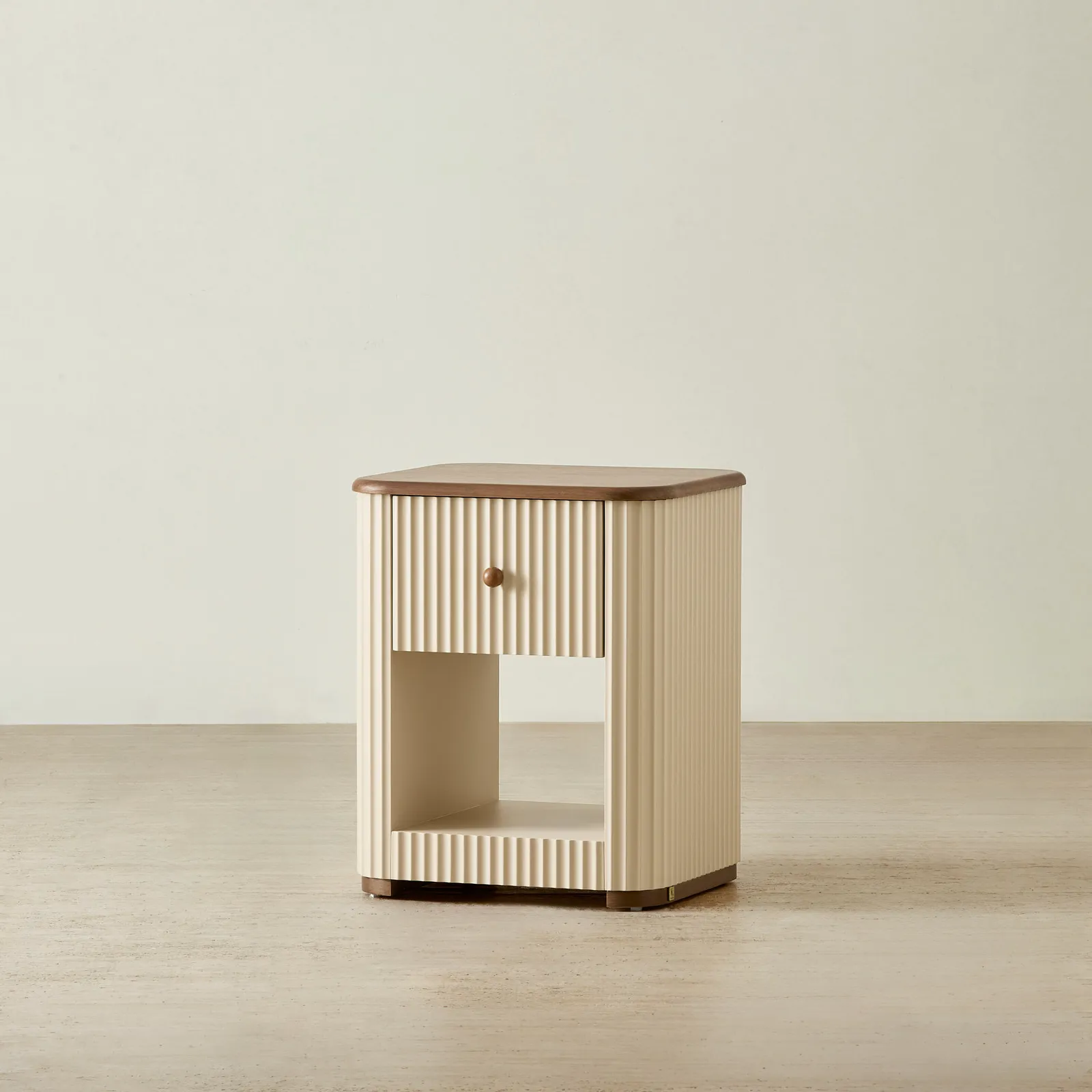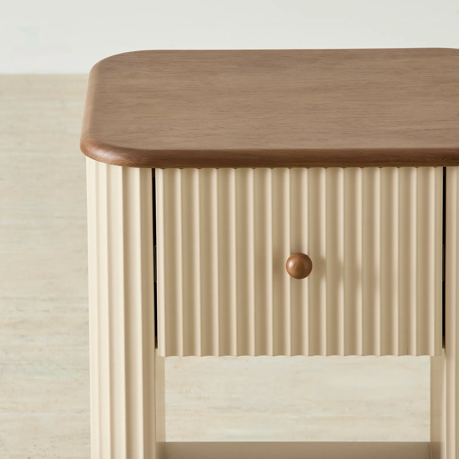 A single drawer with a simple knob holds favorites, while the open shelf below is ready for books, toys, or slippers. Ribbed sides add a playful touch to this sturdy piece made just for little rooms.