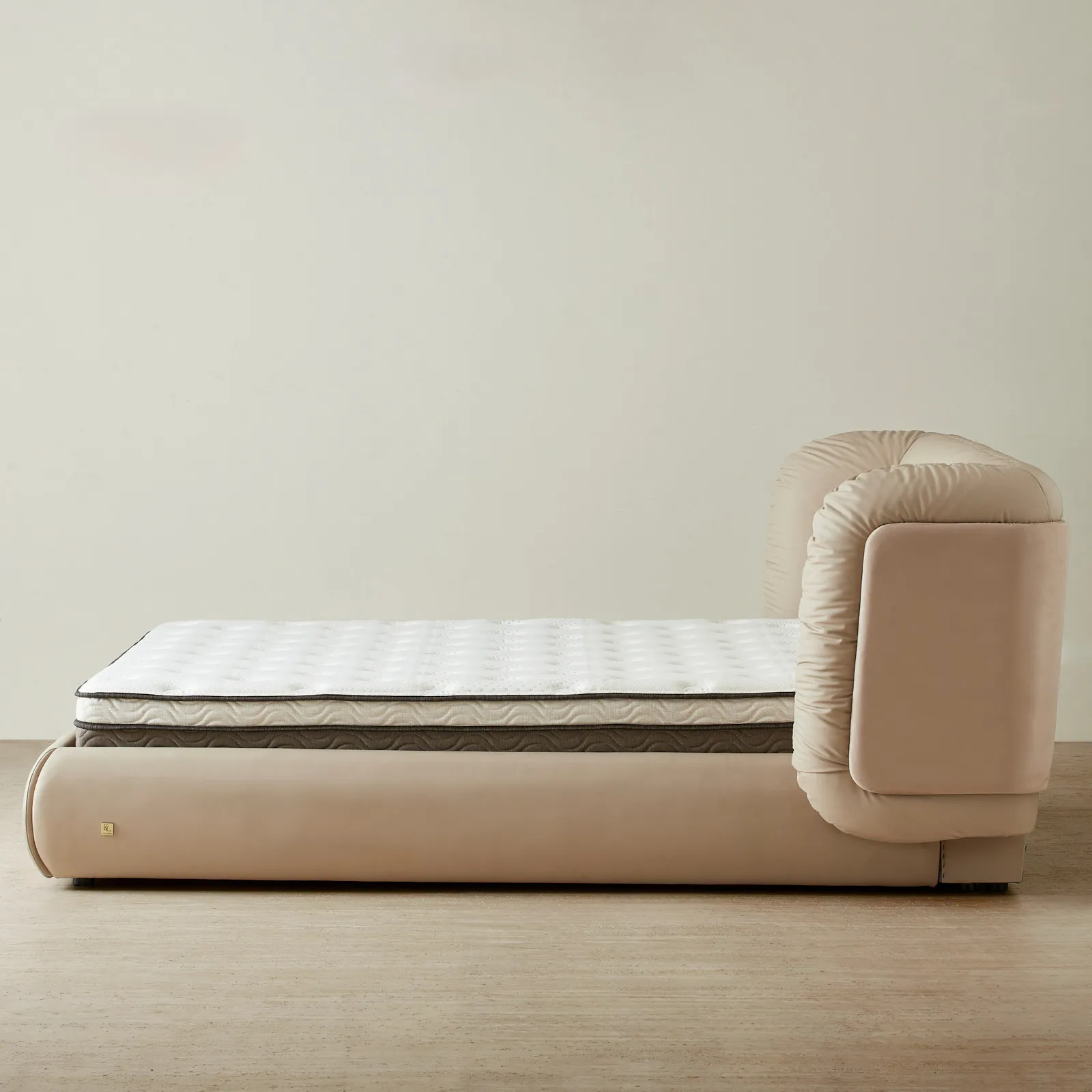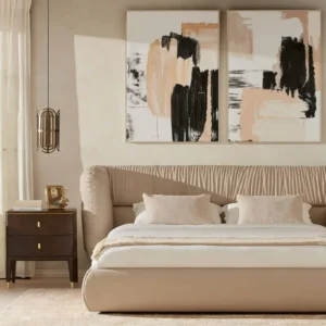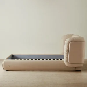 The wide, cushioned headboard and side bolsters offer lounge-like comfort and support. Both practical and eye-catching, it’s a design that balances softness with structure.