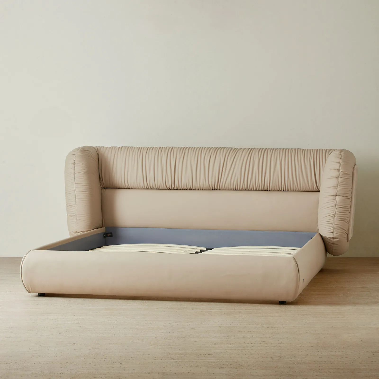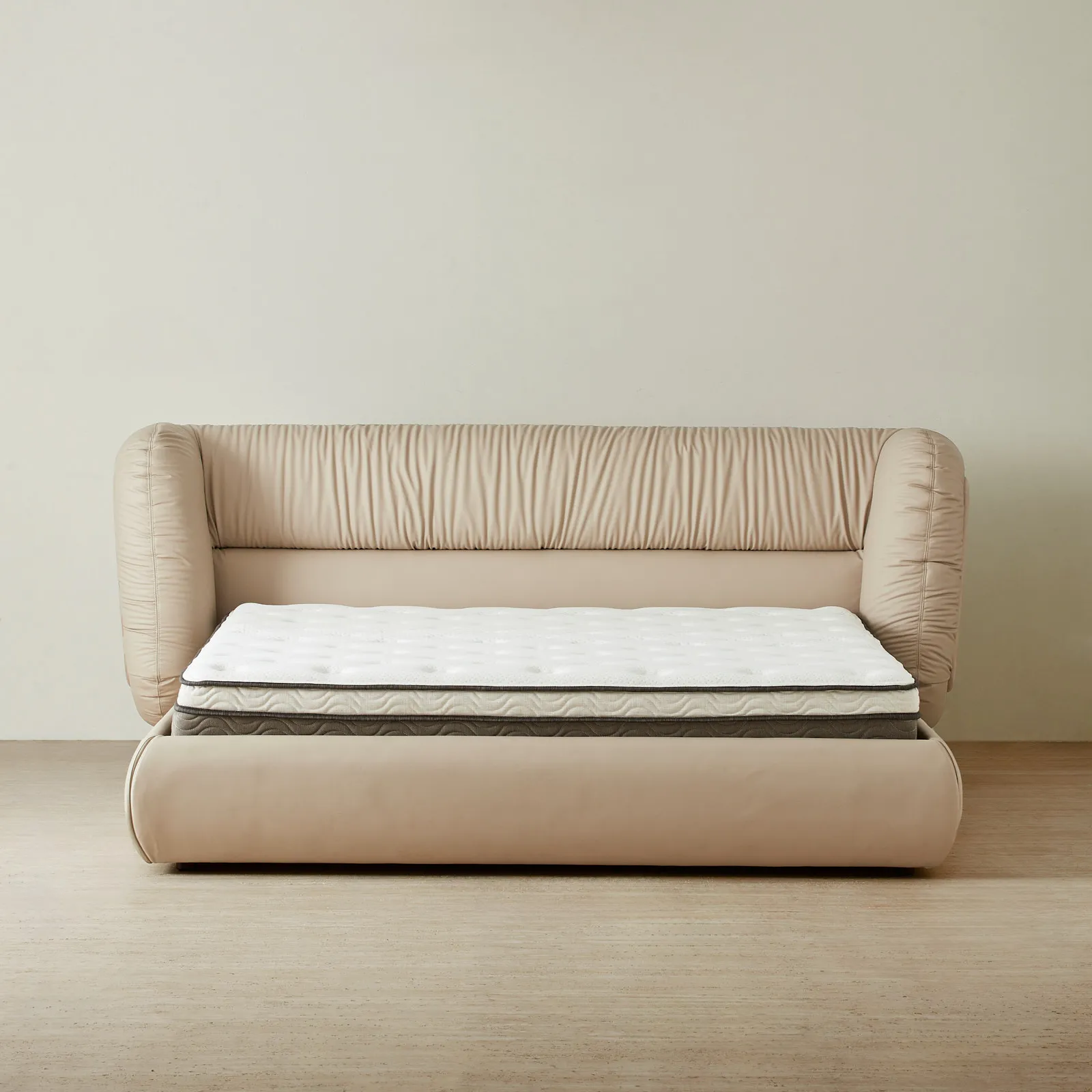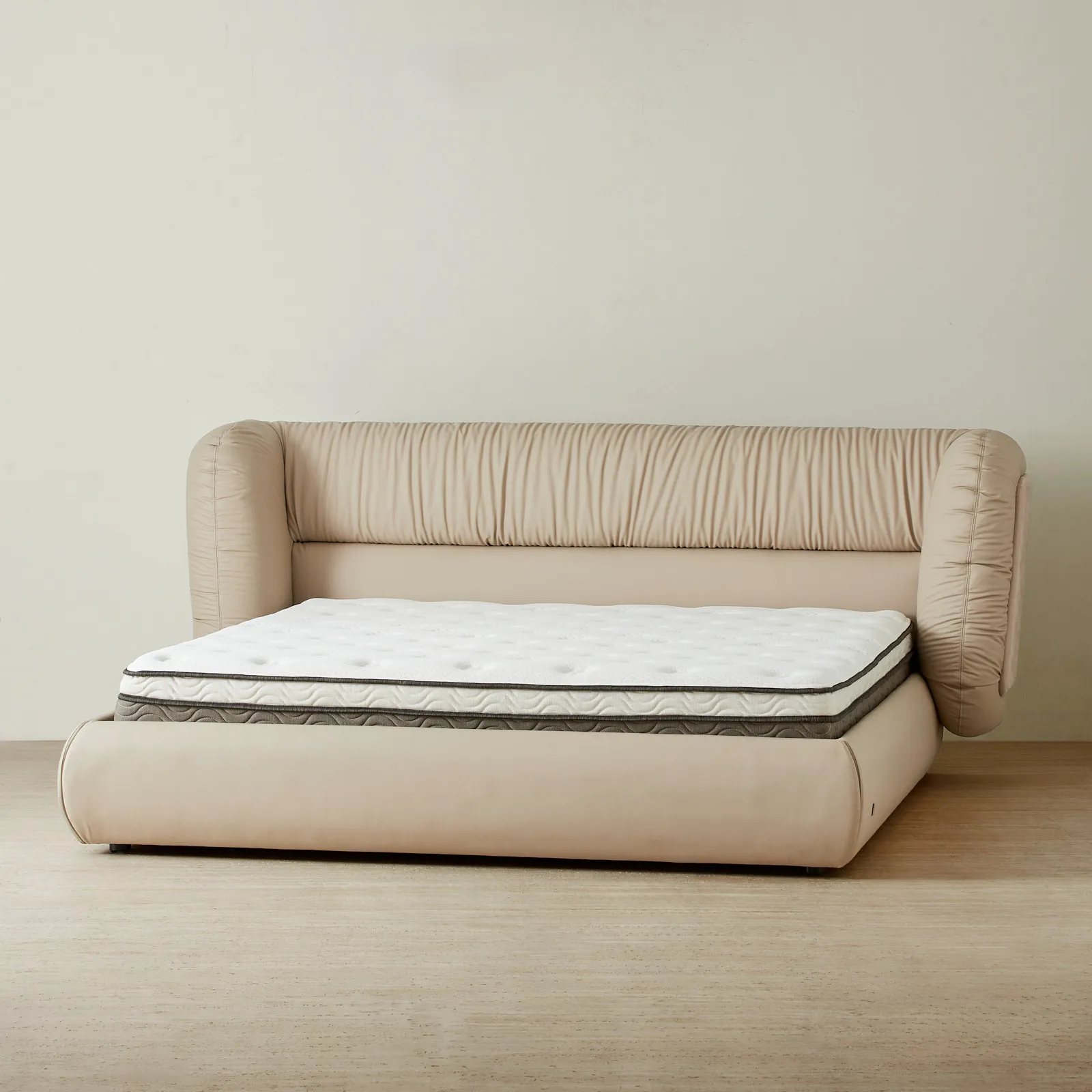 The Martina Bed makes a bold statement with its sculptural silhouette and unique texture. Wrapped in soft beige vegan leather, its gathered upholstery adds a sense of movement to the plush frame.
