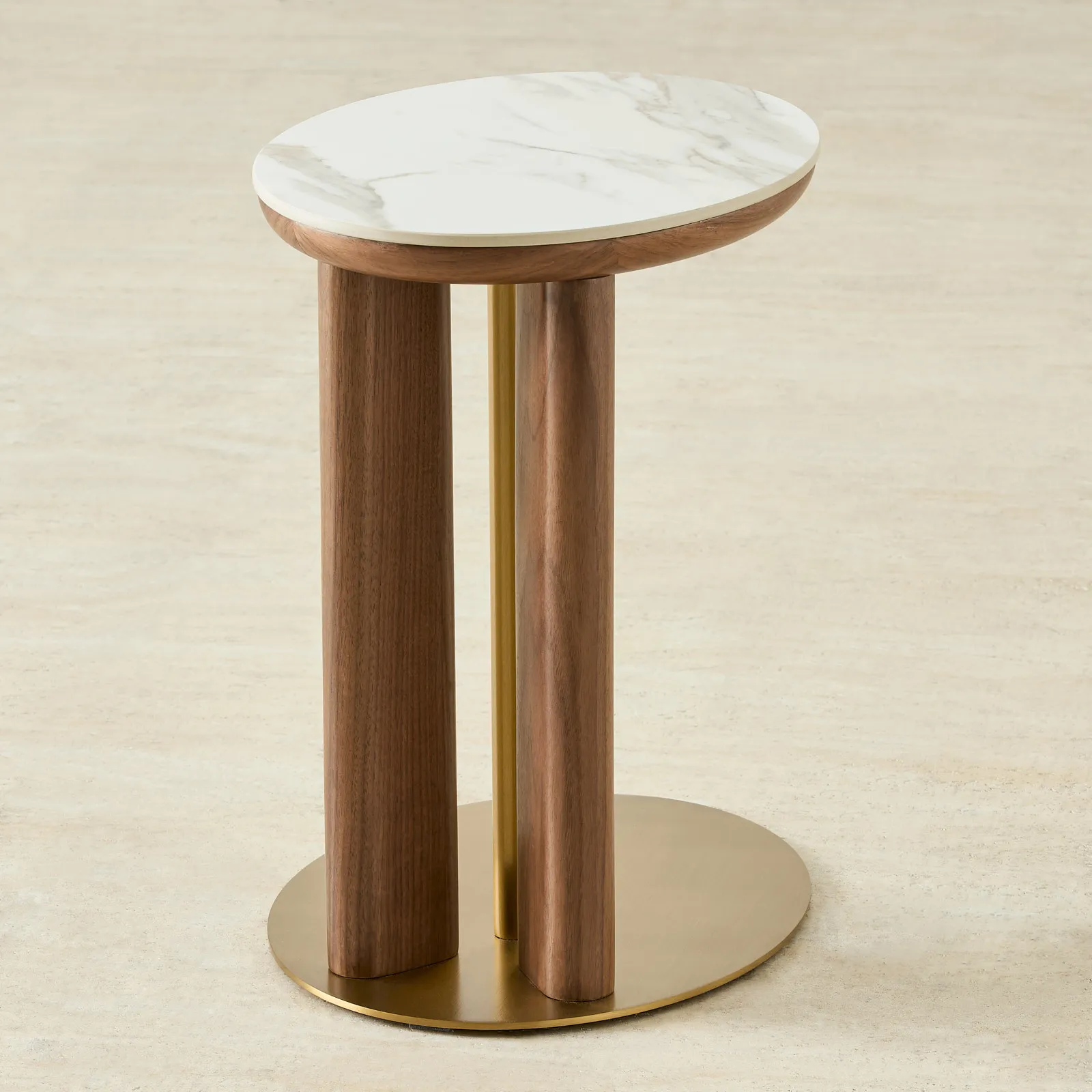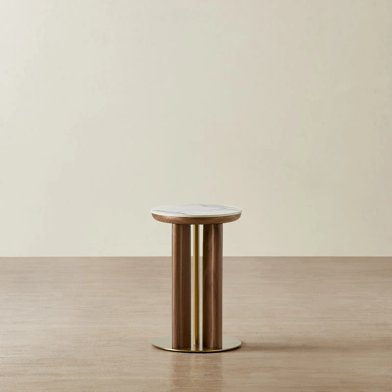 The Sir Lionell Gliding Side Table features a round white sintered stone top with gentle veining, set upon walnut brown wooden legs. The table’s design incorporates open spaces between the legs, creating a refined balance of form and function.