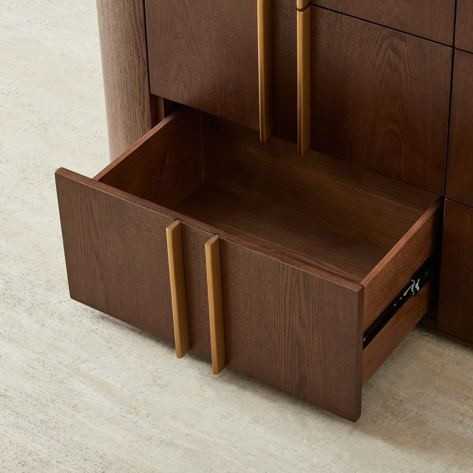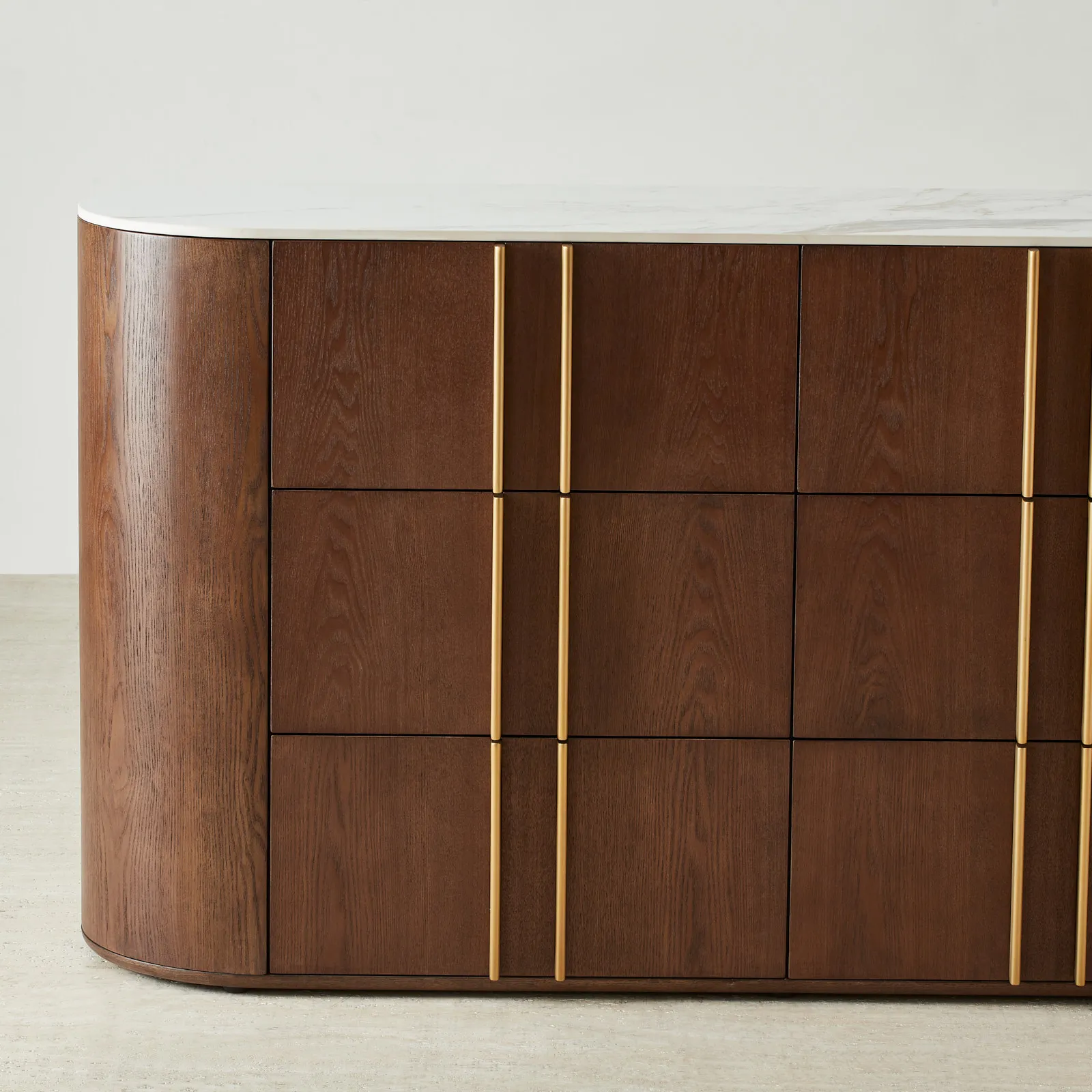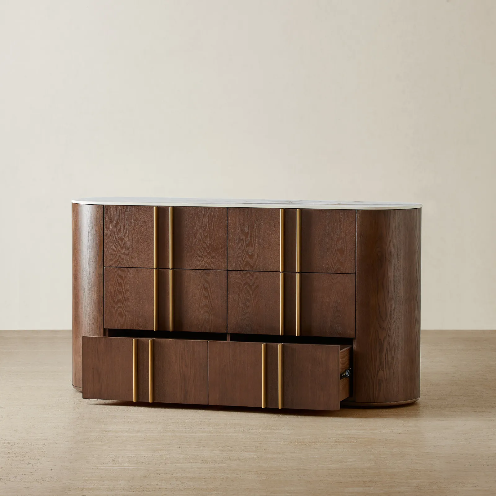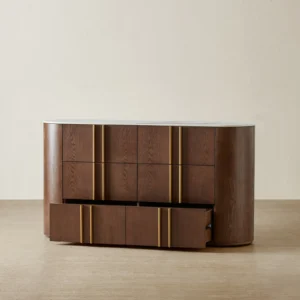 The Sir Lionell Dresser marries timeless form with purposeful function, crowned by a pristine white sintered stone top. Six generous drawers glide open with effortless precision, offering abundant space for your most treasured possessions.