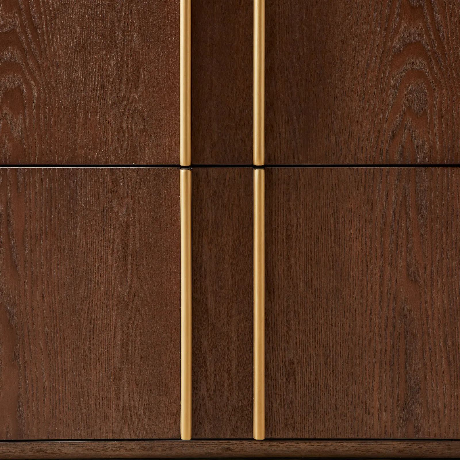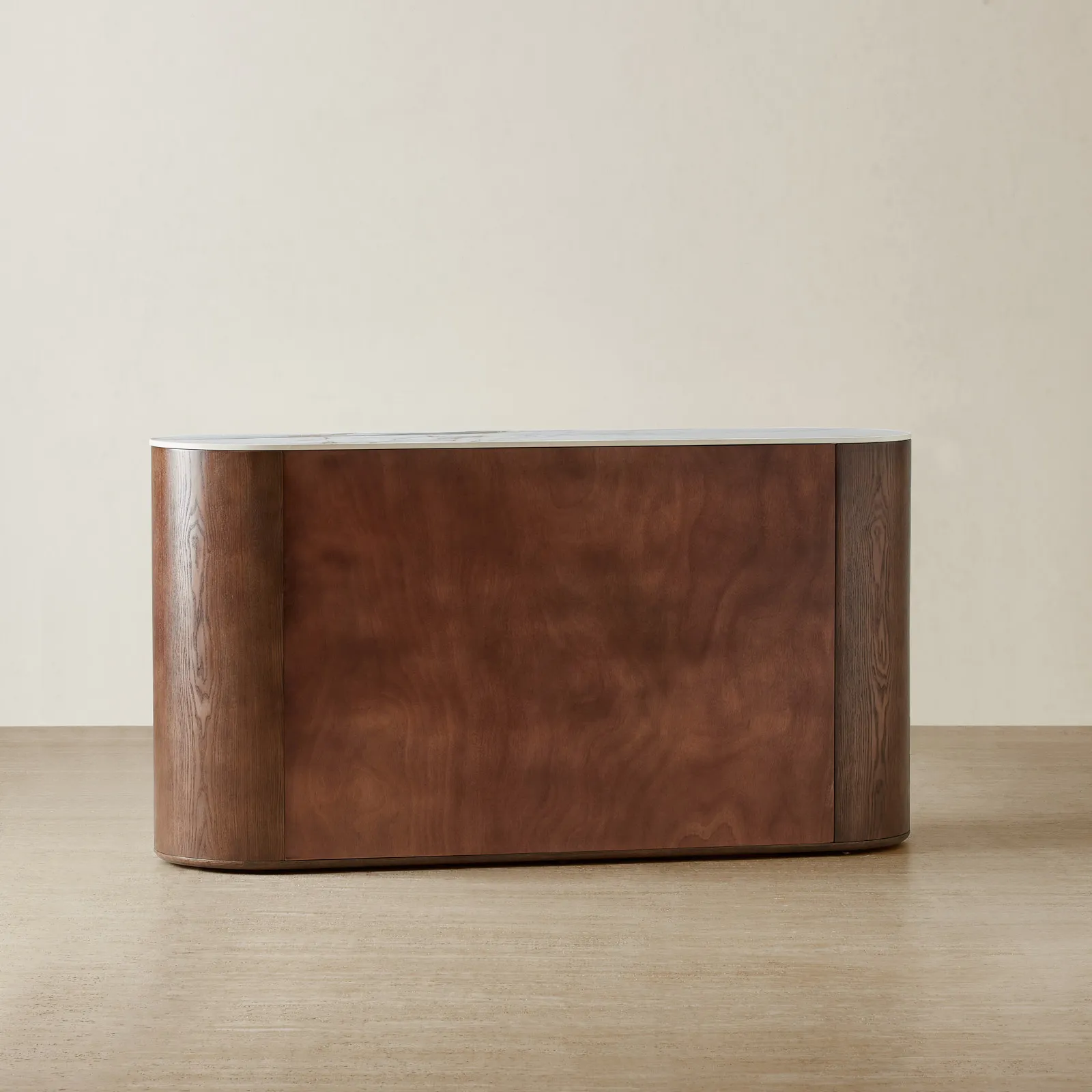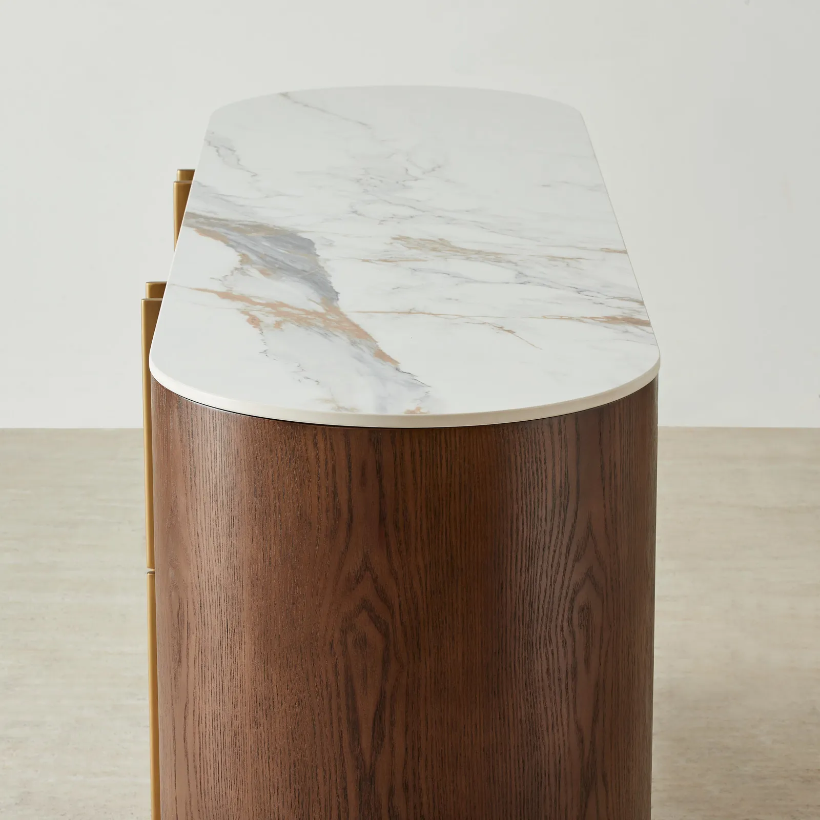 Vertical golden accents rise like elegant columns against the deep amber brown wood, creating a striking sense of balance and rhythm. Gently rounded corners and a grounded wooden base anchor the piece, making it as commanding as it is refined.